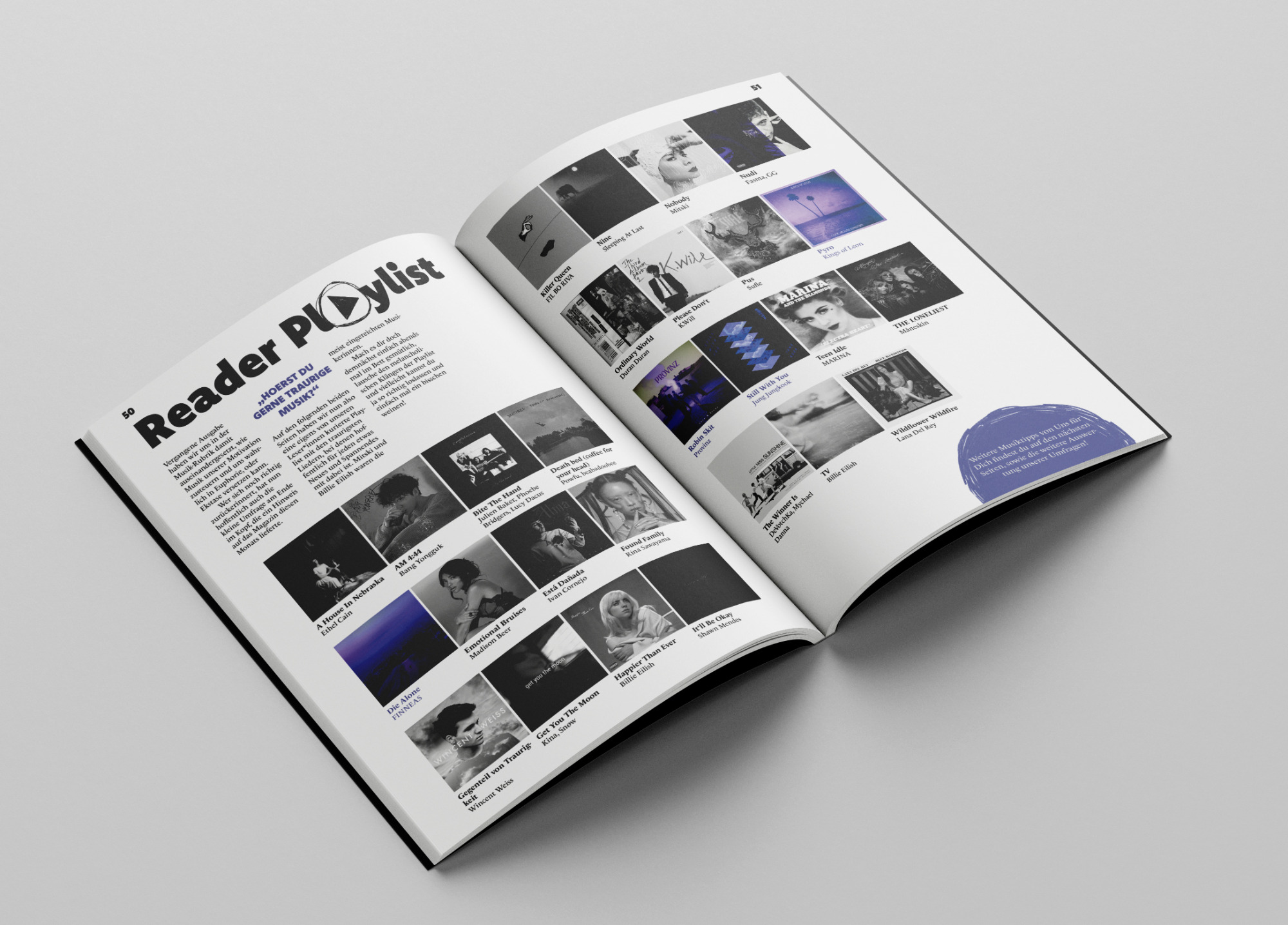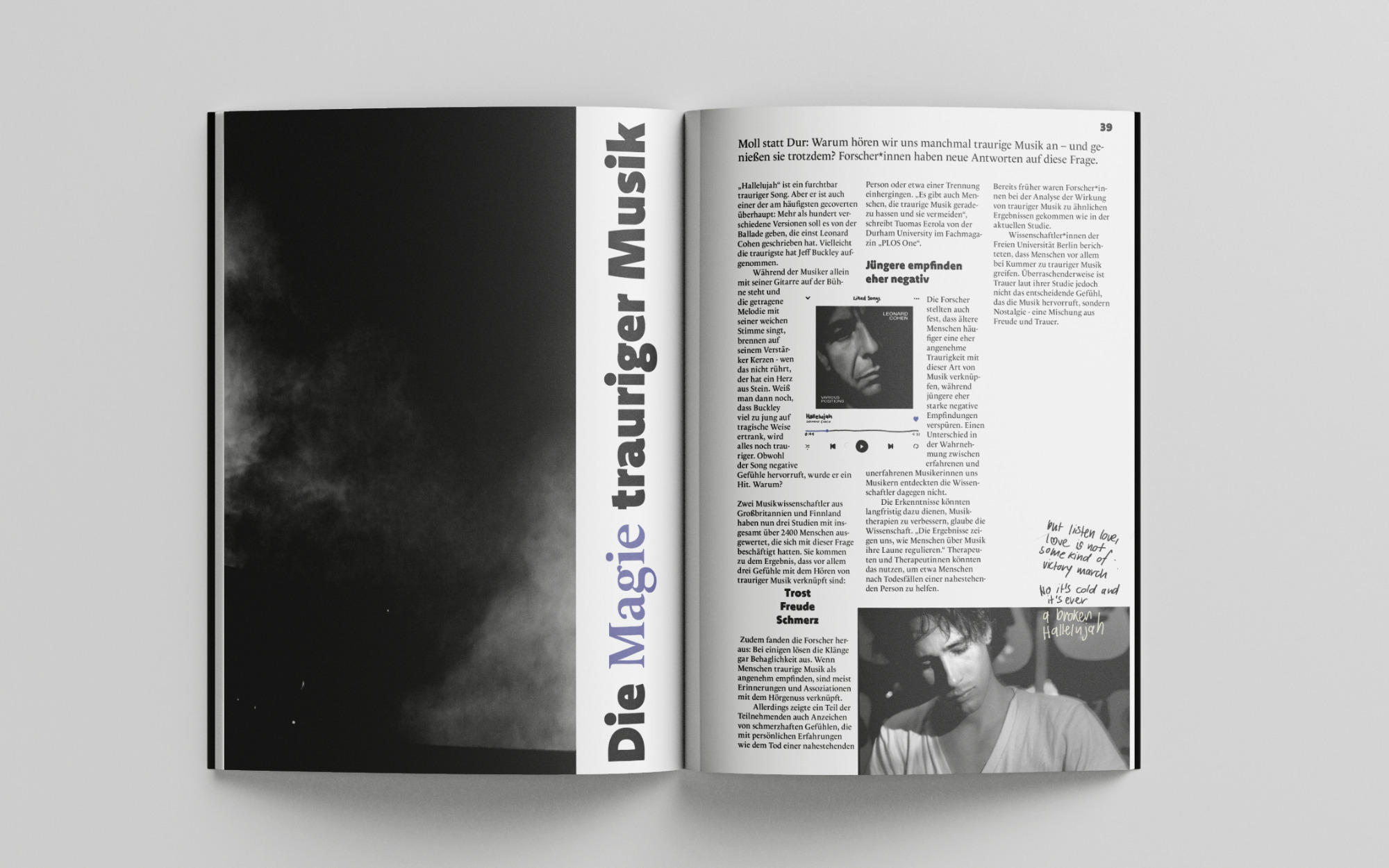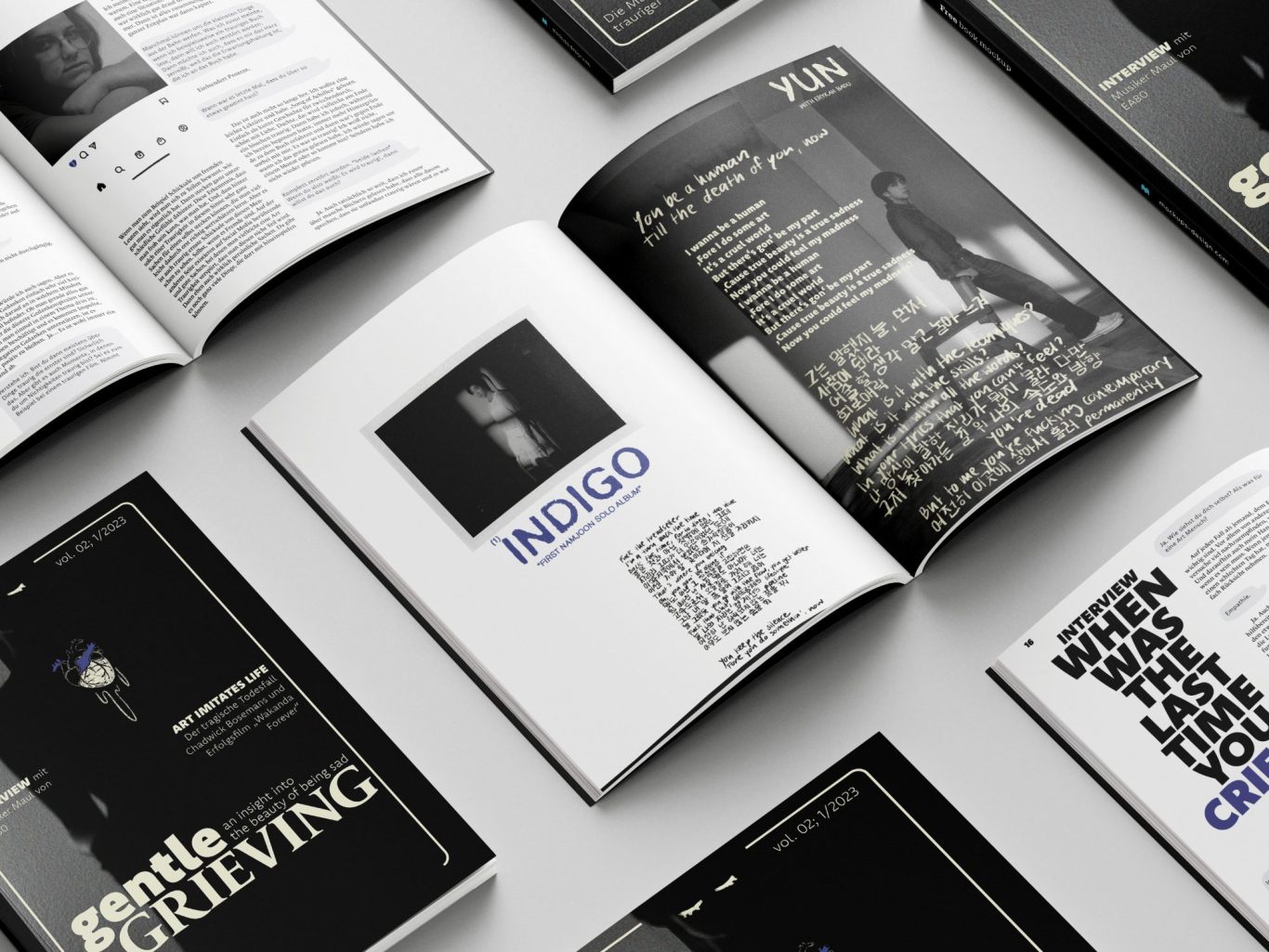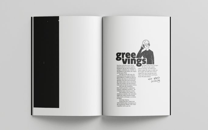 Many texts are directly taken from the internet, since the course's focus was on the layouting of a full magazine and not so much into generating the content for it. Still, I held two interviews and took it upon me to translate some articles from English into German, since I wanted to keep the language consistent without having to pass on impactful texts that I had found. The illustrations and hand-written elements are selfmade.